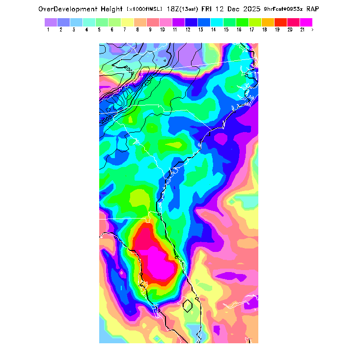 Height of the average dry thermal tops, or Thermal Index TI=0 height.  Over flat terrain maximum thermalling heights will be lower due to the glider descent rate and other factors.  However, thermal tops will be higher over small-scale topography not resolved by the model and some pilots have reported that in elevated terrain the heights they can reach over local terrain features correspond better with the TI=0 height than with Hcrit.  In the presence of clouds the thermal top will increase, but the maximum thermalling height will then be limited by the cloud base (see the "Cloud prediction parameters" section below).  [This parameter is truncated at 22,000 for plotting.]   MoreInfo