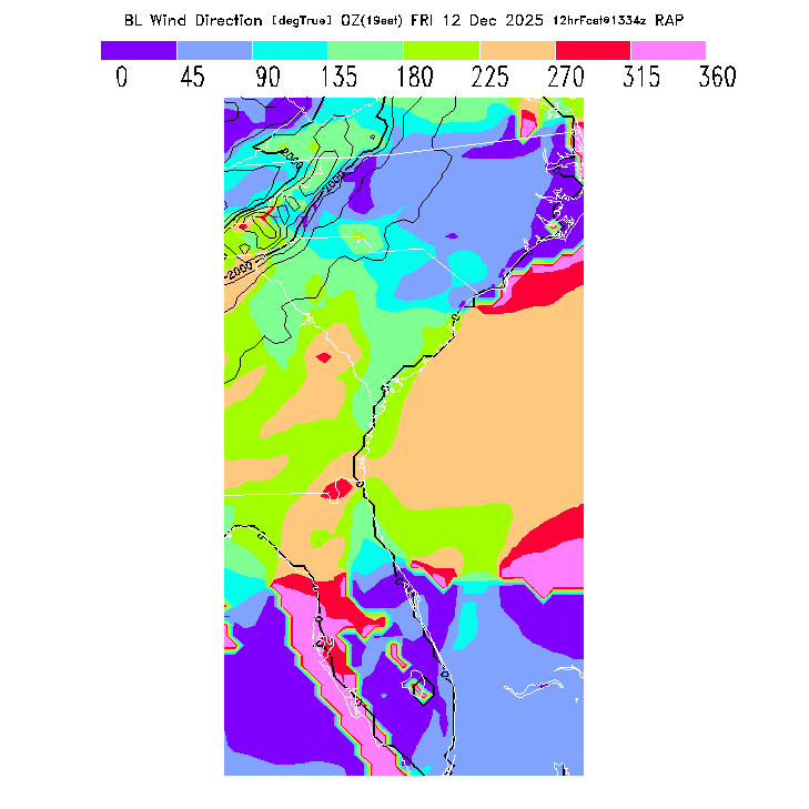 The direction of the vector-averaged wind in the BL.  This prediction can be misleading if there is a large change in wind direction through the BL (for a complex wind profile, any single number is not an adequate descriptor!).  Note that there will be a abrupt artificial gradient at the "cross-over" between 0 and 360 degrees.  MoreInfo