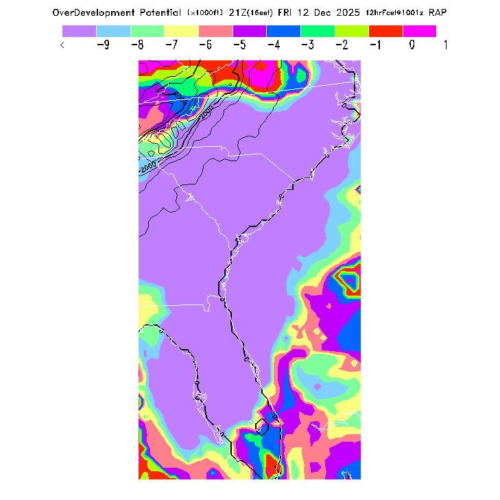 State outlines are depicted on each BLIPMAP in white.  The RAP topography is plotted as black contours, at 500 ft intervals with thicker lines at 2000 ft intervals, to assist in location identification but also to emphasize the smoothed nature of the model topography.  The BLIPMAP does not predict thermal lift created by small-scale terrain features which are not resolved by the model topography, which often give localized updrafts significantly stronger than those over the surrounding smoother terrain.  Maps of location identifiers and additional topography information for this region are available at the SE Grid Orientation webpage.