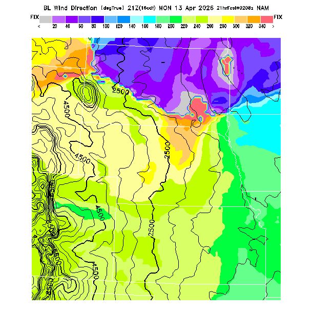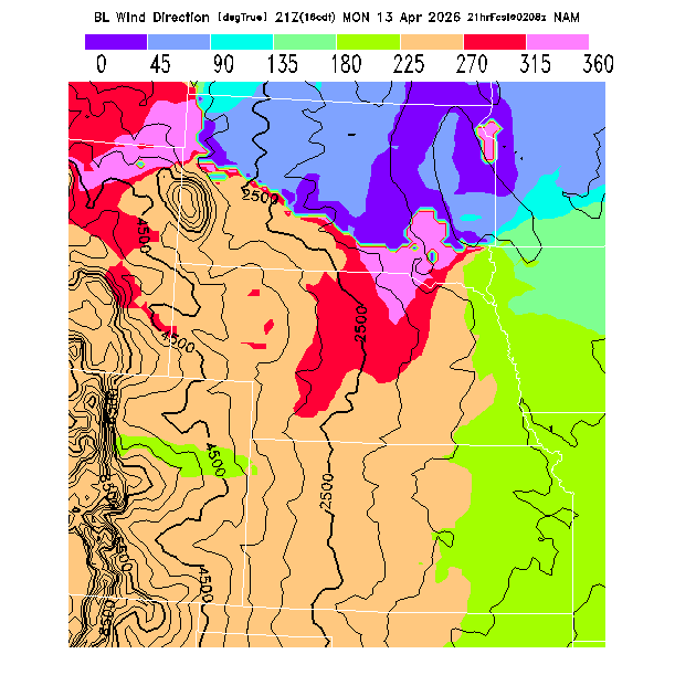 The direction of the vector-averaged wind in the BL.  This prediction can be misleading if there is a large change in wind direction through the BL (for a complex wind profile, any single number is not an adequate descriptor!).  Note that there will be a abrupt artificial gradient at the "cross-over" between 0 and 360 degrees.  MoreInfo