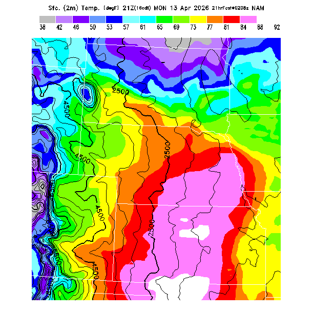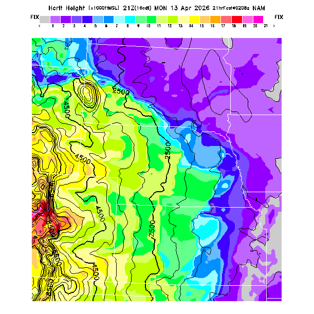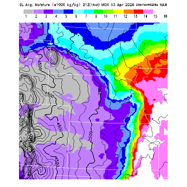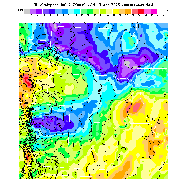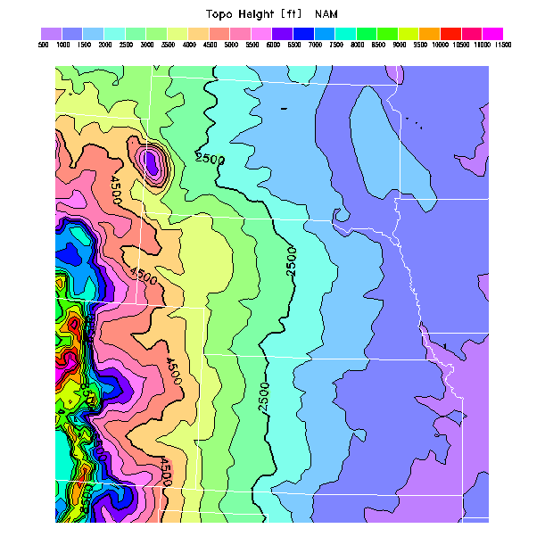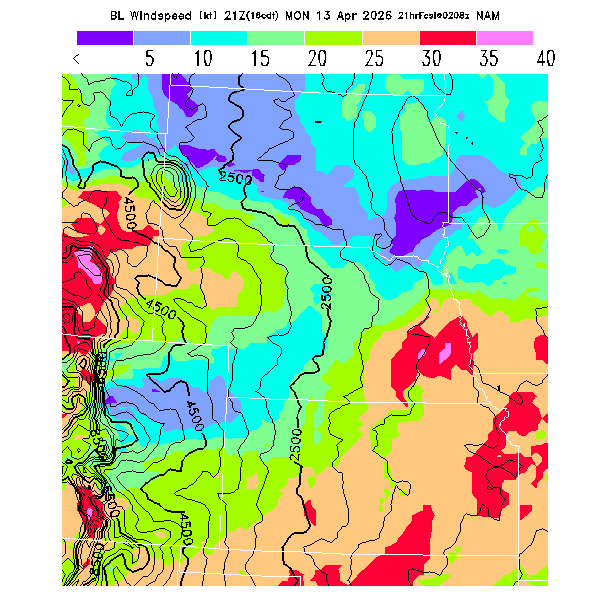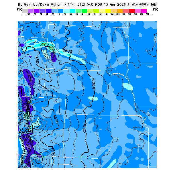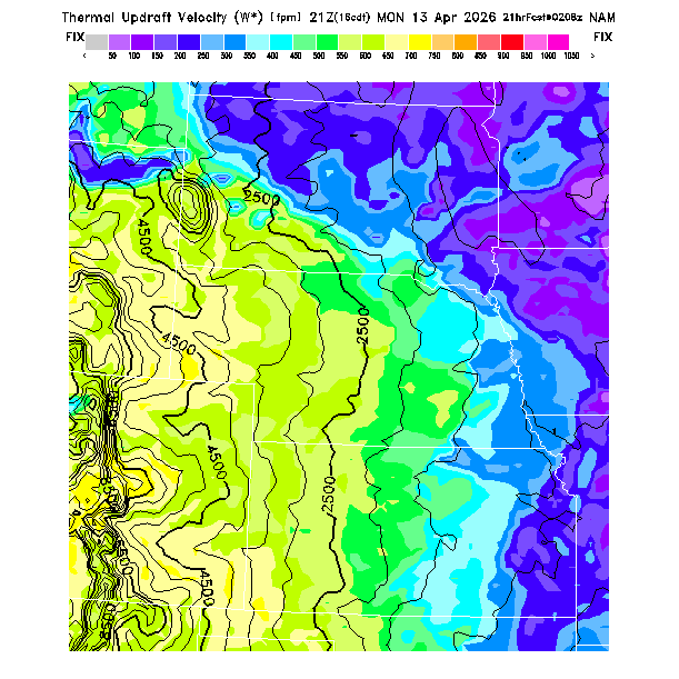 State outlines are depicted on each BLIPMAP in white.  The NAM topography is plotted as black contours, at 500 ft intervals with thicker lines at 2000 ft intervals, to assist in location identification but also to emphasize the smoothed nature of the model topography.  The BLIPMAP does not predict thermal lift created by small-scale terrain features which are not resolved by the model topography, which often give localized updrafts significantly stronger than those over the surrounding smoother terrain.