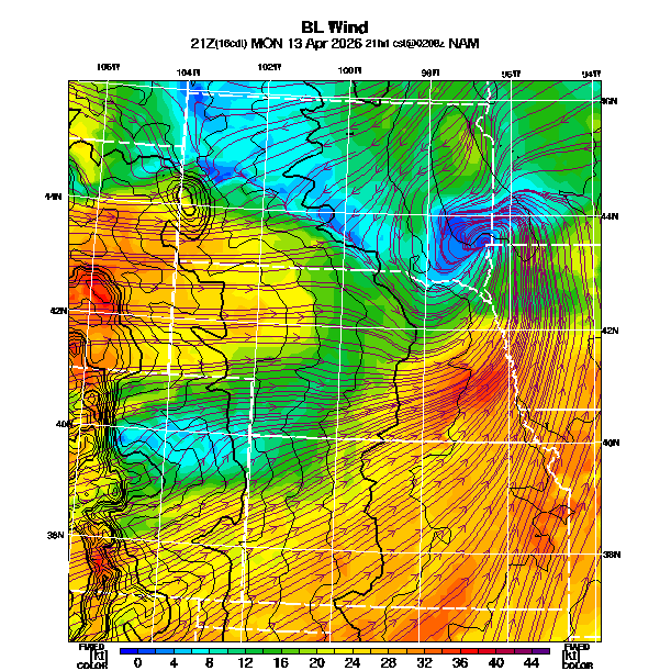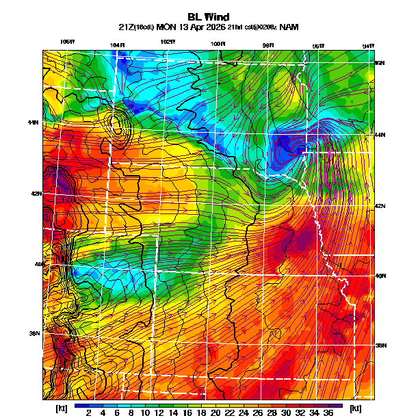 BL Wind Direction streamlines overlay BL Wind Speed contours,  See "Wind Speed in the Boundary Layer" and "Wind Direction in the Boundary Layer" parameter descriptions below for more information.