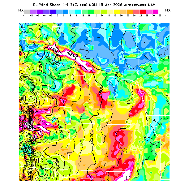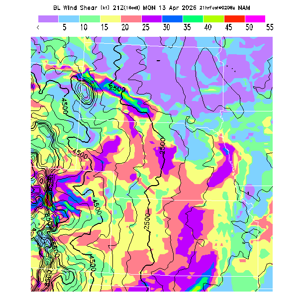 The magnitude of the vector wind difference between the top and bottom of the BL.  Note that this represents vertical wind shear and does not indicate "shear lines" (which are horizontal changes of wind speed/direction).  MoreInfo