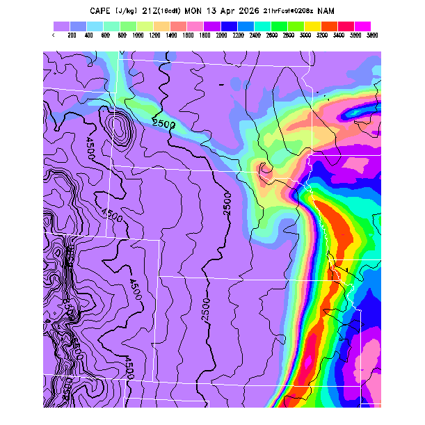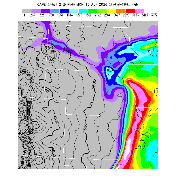 Convective Available Potential Energy indicates the atmospheric stability affecting deep convective cloud formation above the BL.  A higher value indicates greater potential instability, larger updraft velocities within deep convective clouds, and greater potential for thunderstorm development (since a trigger is needed to release that potential).  Note that thunderstorms may develop in regions of high CAPE and then get transported downwind to regions of lower CAPE.  Also, locations where both convergence and CAPE values are high can be subject to explosive thunderstorm development.   MoreInfo