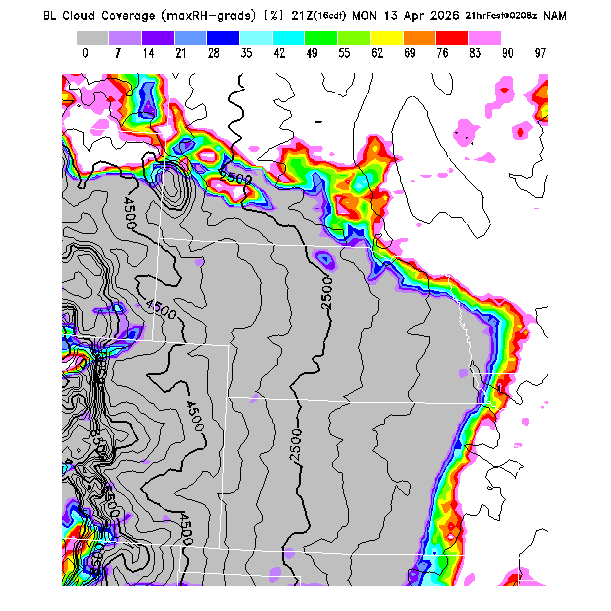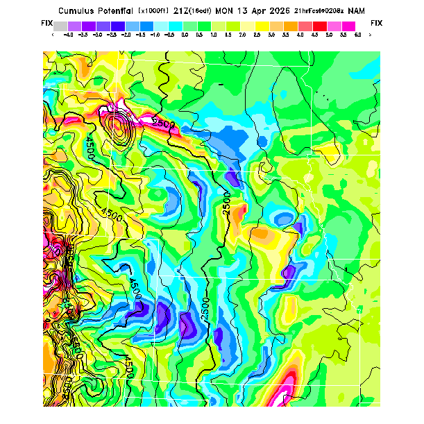 This evaluates the potential for small, non-extensive "puffy cloud" formation in the BL, being the height difference between the surface-based LCL (see below) and the BL top.  Small cumulus clouds are (simply) predicted when the parameter positive, but it is quite possible that the threshold value is actually greater than zero for your location so empirical evaluation is advised.  I would be interested in receiving end-of-season reports on what threshold value worked for your site.  Clouds can also occur with negative values if the air is lifted up the indicated vertical distance by flow up a small-scale ridge not resolved by the model's smoothed topography.  [This parameter is truncated at -10,000 for plotting.]   MoreInfo