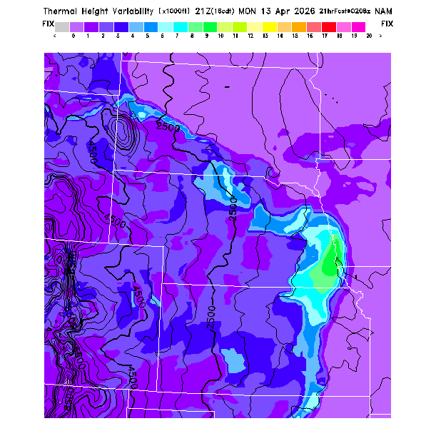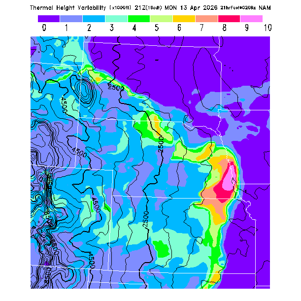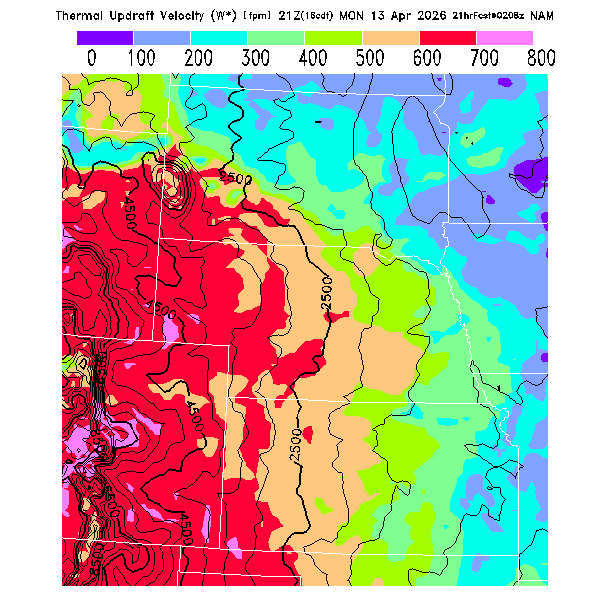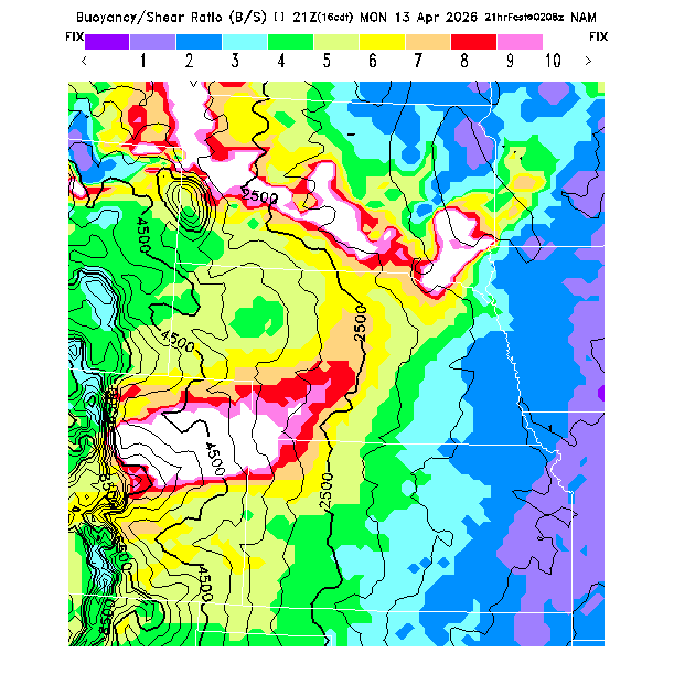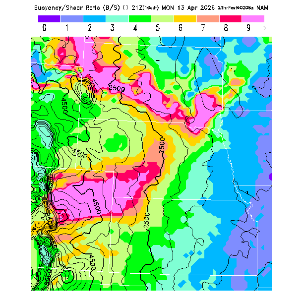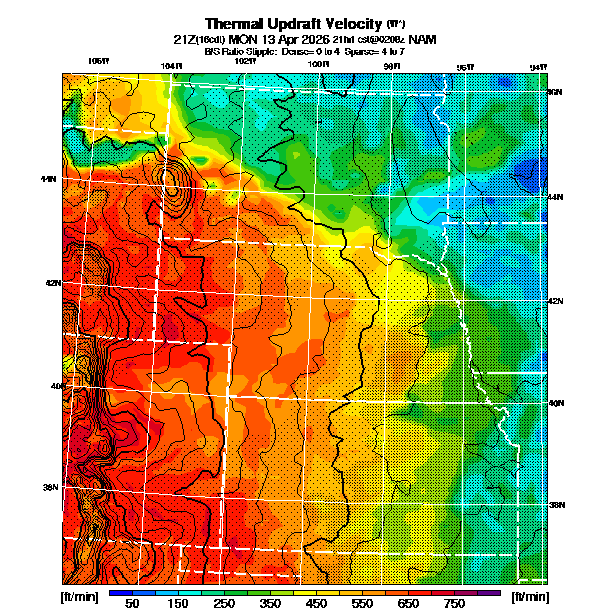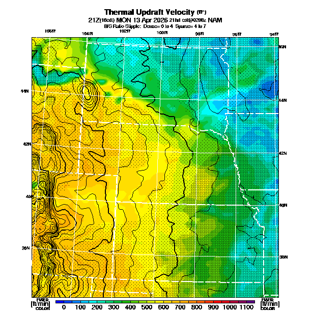 B/S Ratio stippling (dense=0-4 sparse=4-7) overlays Thermal Updraft Velocity contours to indicate where strong thermals can be broken by vertical wind shear.  See "Thermal Updraft Velocity" and "Buoyancy/Shear Ratio" parameter descriptions below for more information.