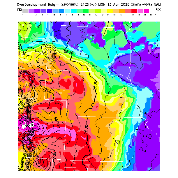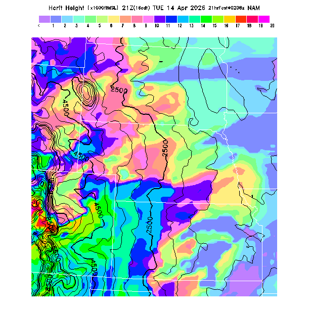 Height of the average dry thermal tops, or Thermal Index TI=0 height.  Over flat terrain maximum thermalling heights will be lower due to the glider descent rate and other factors.  However, thermal tops will be higher over small-scale topography not resolved by the model and some pilots have reported that in elevated terrain the heights they can reach over local terrain features correspond better with the TI=0 height than with Hcrit.  In the presence of clouds the thermal top will increase, but the maximum thermalling height will then be limited by the cloud base (see the "Cloud prediction parameters" section below).  [This parameter is truncated at 22,000 for plotting.]   MoreInfo