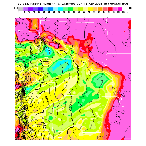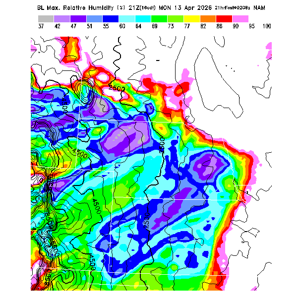 This parameter provides an additional means of evaluating the formation of clouds within the BL and might be used either in conjunction with or instead of the other cloud prediction parameters.  Larger values indicate greater cloud probability, but use of this parameter must be empirical since no theoretical guidance is available - for example, pilots must determine by actual experience the percentage that correlates with formation of clouds above local mountains.  The cloud base height is not predicted, but is expected to be below the TI=0 height.  MoreInfo