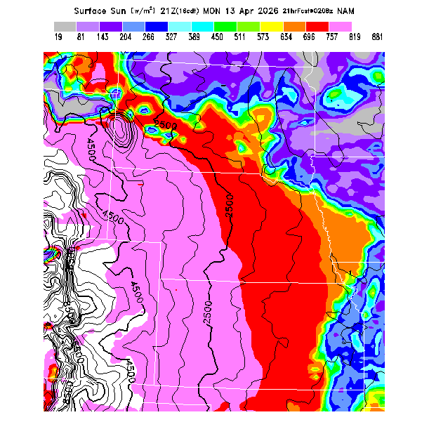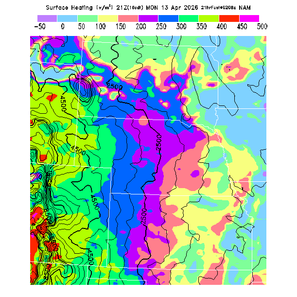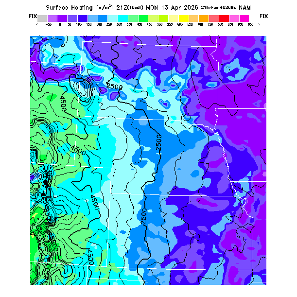 BLIPMAPs predict thermal soaring conditions resulting from surface heating of the Boundary Layer (BL), the scientific term for the turbulent atmospheric region mixed by surface-based thermals (so thermal tops occur at the top of the BL).  The BLIPMAP program post-processes numerical weather model predictions to provide parameters suited to the needs of soaring pilots and presents them in graphical format, as in this sample BLIPMAP.  Relative differences, both in location and in time, are expected to be more reliable indicators of soaring differences than are the precise numerical values.  BASIC thermal forecast parameters gives a short list of the parameters most important for thermal soaring.