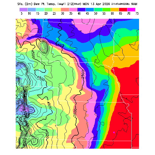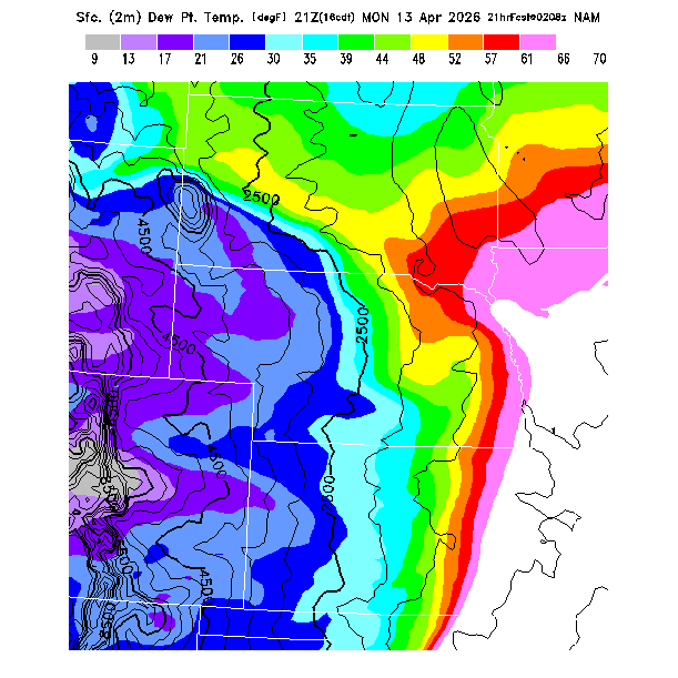 This model-predicted surface dew point temperature can be compared to the actual dew point temperature at 2m during the day to evaluate the accuracy of model moisture predictions.  MoreInfo