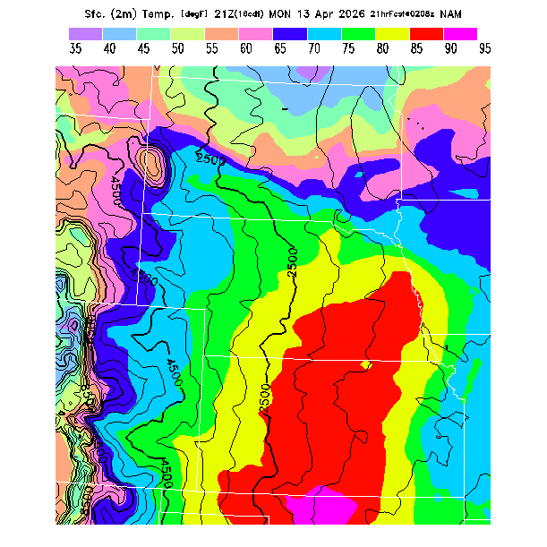 A continuing sequence of forecasts, all for the same validation time of 21Z, are produced as new observational data becomes available, each updated forecast having a shorter forecast period between the latest observation and validation times.  [Model initialization (observation analysis) time + Forecast Period = Validation (forecast) time]  The "CurrentDay" forecasts are based upon the current GMT day given above, which changes at 0Z, with "Current+1" and "Current+2" giving predictions for the following two days.  The last link, "PreviousDay", gives the last forecast from the previous day's prediction sequence, useful for those who want to compare their experiences from yesterday's flight to the NAM BLIPMAP predictions.  At the top of each forecast plot is the name of the parameter, the validation date and time, the forecast period, and the data source.