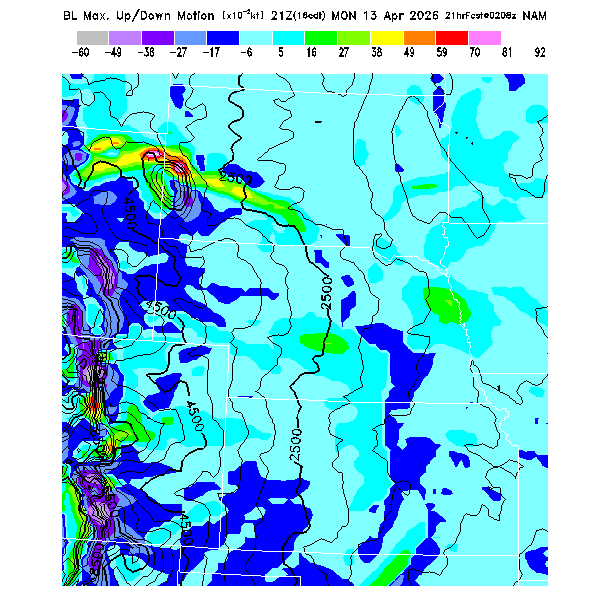 Maximum grid-area-averaged extensive upward or downward motion within the BL as created by horizontal wind convergence.  Positive convergence is associated with local small-scale convergence lines (often called "shear lines" by pilots, meaning horizontal changes of wind speed/direction) - however, the actual size of such features is much smaller than can be resolved by the model so only stronger ones will be forecast and their predictions are subject to much error.  If CAPE is also large, thunderstorms can be triggered.  Negative convergence (divergence) produces subsiding vertical motion, creating low-level inversions which limit thermalling heights.  This parameter can be noisy, so users should be wary.  MoreInfo
