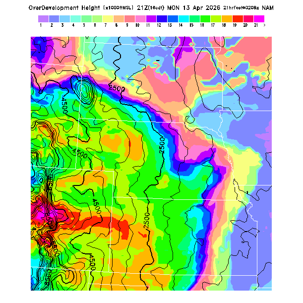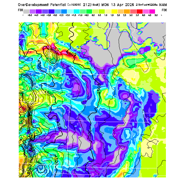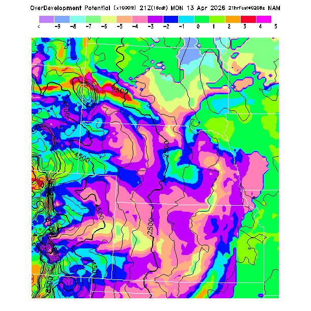 This evaluates the potential for extensive cloud formation (OvercastDevelopment) at the BL top, being the height difference between the BL CL (see below) and the BL top.  Extensive clouds and likely overcast development are predicted when the parameter is positive, with overcast development being increasingly more likely with higher positive values.  OvercastDevelopment can also occur with negative values if the air is lifted up the indicated vertical distance by flow up a small-scale ridge not resolved by the model's smoothed topography.  [This parameter is truncated at -10,000 for plotting.]   MoreInfo