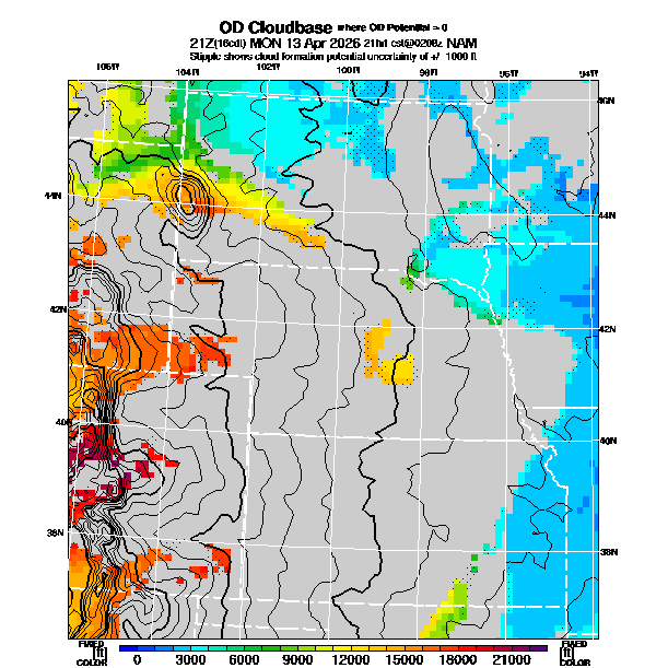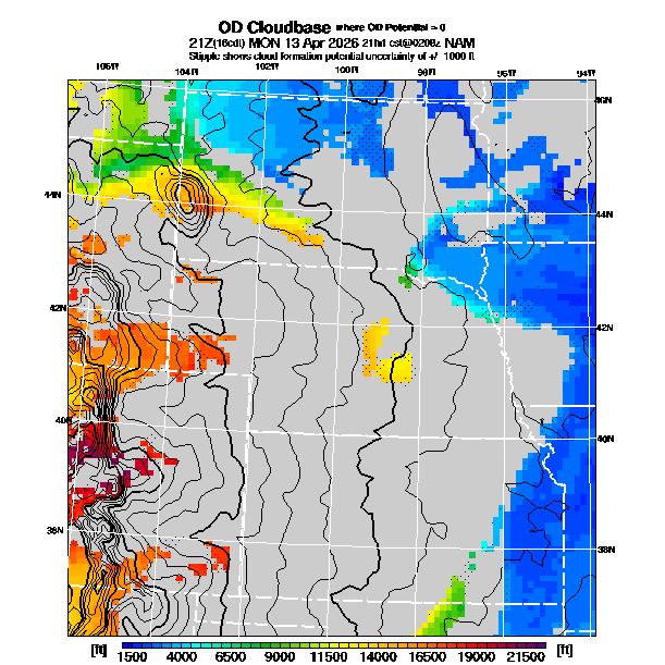 OvercastDevelopment Cloudbase Cloudbase contours are plotted only where that cloudbase is theoretically expected.  See "OvercastDevelopment Potential" and "OvercastDevelopment Cloudbase" parameter descriptions below for more information.  This composite is useful only for locations where the actual potential threshold for OD cloud production agrees with the theoretically-predicted value of zero.