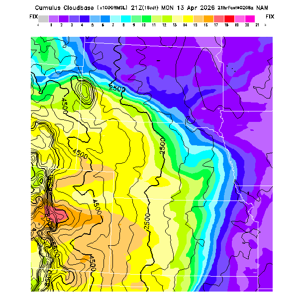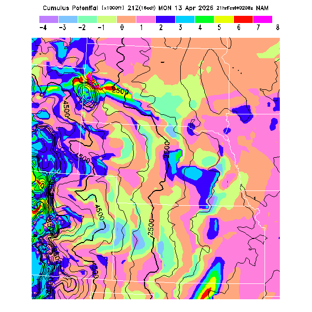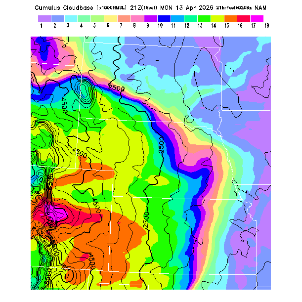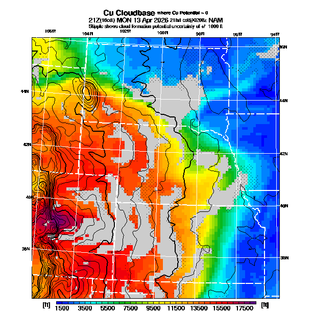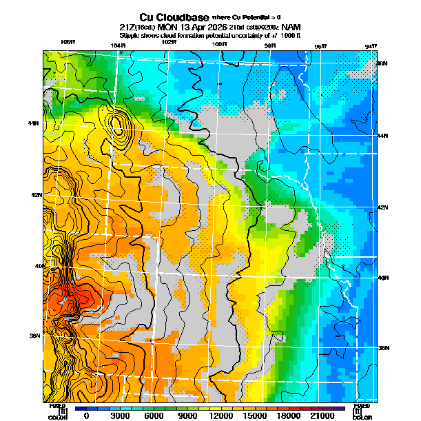 Cu Cloudbase Cloudbase contours are plotted only where that cloudbase is theoretically expected.  See "Cumulus Potential" and "Cumulus Cloudbase" parameter descriptions below for more information.  This composite is useful only for locations where the actual potential threshold for cumulus cloud production agrees with the theoretically-predicted value of zero.