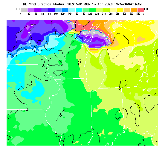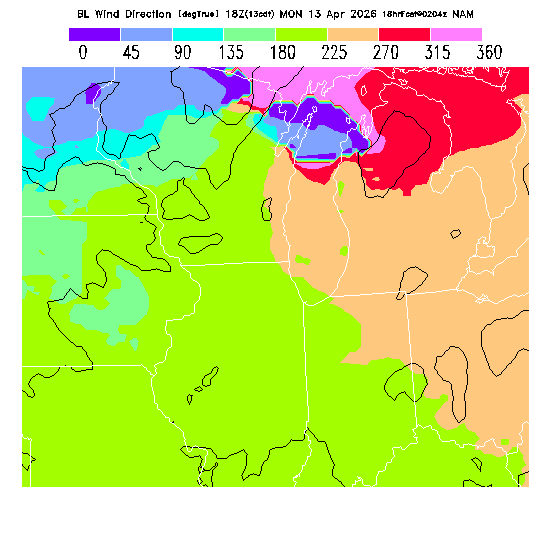 The direction of the vector-averaged wind in the BL.  This prediction can be misleading if there is a large change in wind direction through the BL (for a complex wind profile, any single number is not an adequate descriptor!).  Note that there will be a abrupt artificial gradient at the "cross-over" between 0 and 360 degrees.  MoreInfo