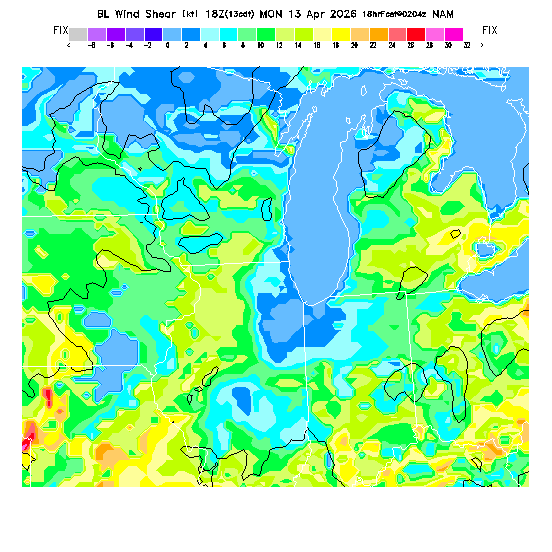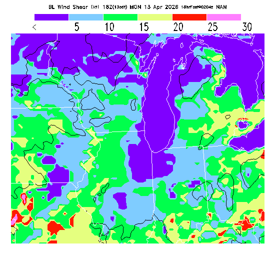 The magnitude of the vector wind difference between the top and bottom of the BL.  Note that this represents vertical wind shear and does not indicate "shear lines" (which are horizontal changes of wind speed/direction).  MoreInfo