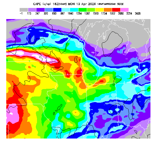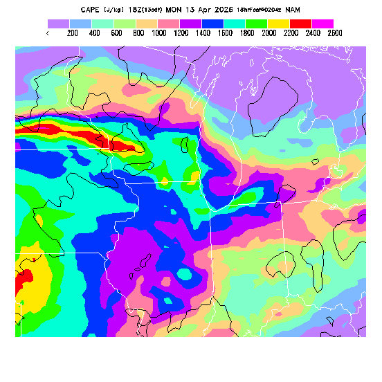 Convective Available Potential Energy indicates the atmospheric stability affecting deep convective cloud formation above the BL.  A higher value indicates greater potential instability, larger updraft velocities within deep convective clouds, and greater potential for thunderstorm development (since a trigger is needed to release that potential).  Note that thunderstorms may develop in regions of high CAPE and then get transported downwind to regions of lower CAPE.  Also, locations where both convergence and CAPE values are high can be subject to explosive thunderstorm development.   MoreInfo