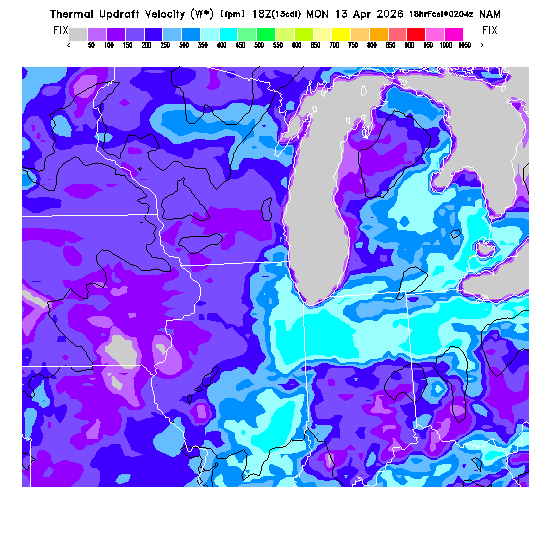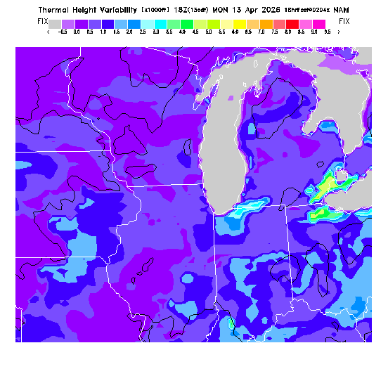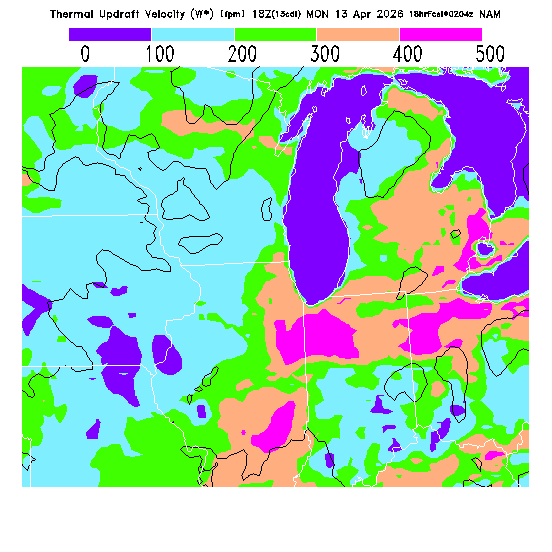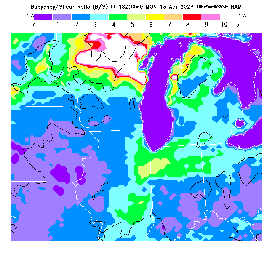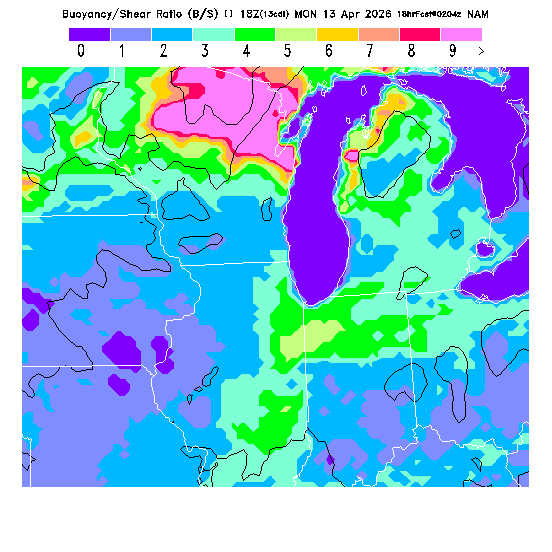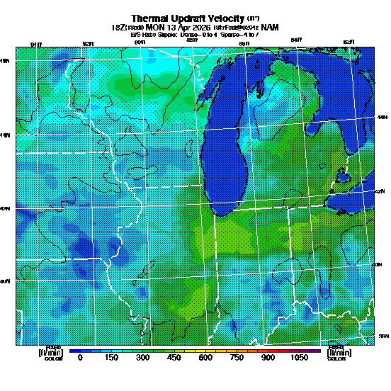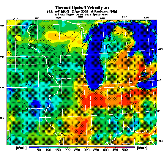 B/S Ratio stippling (dense=0-4 sparse=4-7) overlays Thermal Updraft Velocity contours to indicate where strong thermals can be broken by vertical wind shear.  See "Thermal Updraft Velocity" and "Buoyancy/Shear Ratio" parameter descriptions below for more information.