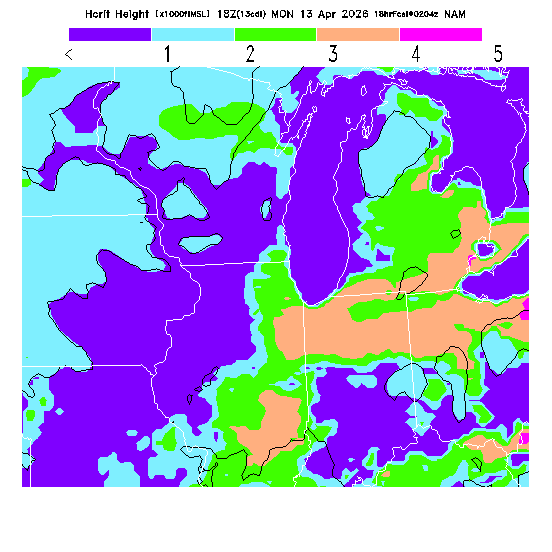 A continuing sequence of forecasts, all for the same validation time of 18Z, are produced as new observational data becomes available, each updated forecast having a shorter forecast period between the latest observation and validation times.  [Model initialization (observation analysis) time + Forecast Period = Validation (forecast) time]  The "CurrentDay" forecasts are based upon the current GMT day given above, which changes at 0Z, with "Current+1" and "Current+2" giving predictions for the following two days.  The last link, "PreviousDay", gives the last forecast from the previous day's prediction sequence, useful for those who want to compare their experiences from yesterday's flight to the NAM BLIPMAP predictions.  At the top of each forecast plot is the name of the parameter, the validation date and time, the forecast period, and the data source.