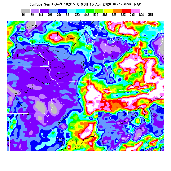 BLIPMAPs predict thermal soaring conditions resulting from surface heating of the Boundary Layer (BL), the scientific term for the turbulent atmospheric region mixed by surface-based thermals (so thermal tops occur at the top of the BL).  The BLIPMAP program post-processes numerical weather model predictions to provide parameters suited to the needs of soaring pilots and presents them in graphical format, as in this sample BLIPMAP.  Relative differences, both in location and in time, are expected to be more reliable indicators of soaring differences than are the precise numerical values.  BASIC thermal forecast parameters gives a short list of the parameters most important for thermal soaring.