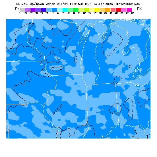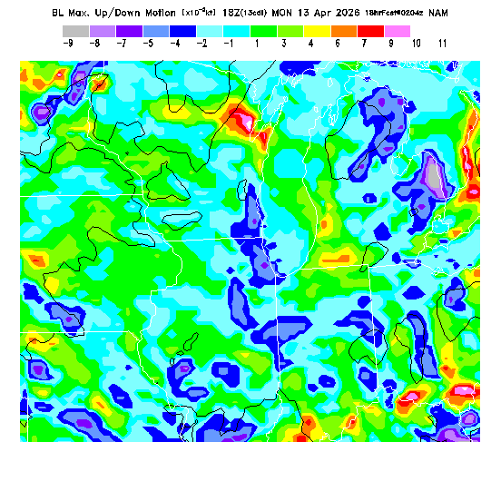Maximum grid-area-averaged extensive upward or downward motion within the BL as created by horizontal wind convergence.  Positive convergence is associated with local small-scale convergence lines (often called "shear lines" by pilots, meaning horizontal changes of wind speed/direction) - however, the actual size of such features is much smaller than can be resolved by the model so only stronger ones will be forecast and their predictions are subject to much error.  If CAPE is also large, thunderstorms can be triggered.  Negative convergence (divergence) produces subsiding vertical motion, creating low-level inversions which limit thermalling heights.  This parameter can be noisy, so users should be wary.  MoreInfo