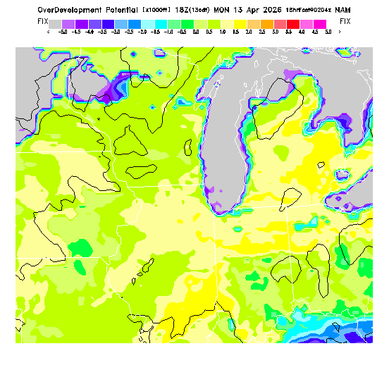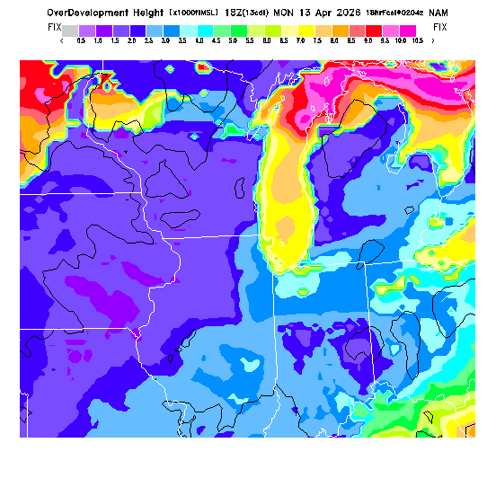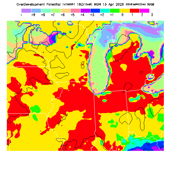 This evaluates the potential for extensive cloud formation (OvercastDevelopment) at the BL top, being the height difference between the BL CL (see below) and the BL top.  Extensive clouds and likely overcast development are predicted when the parameter is positive, with overcast development being increasingly more likely with higher positive values.  OvercastDevelopment can also occur with negative values if the air is lifted up the indicated vertical distance by flow up a small-scale ridge not resolved by the model's smoothed topography.  [This parameter is truncated at -10,000 for plotting.]   MoreInfo