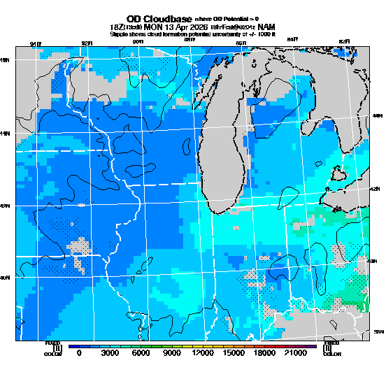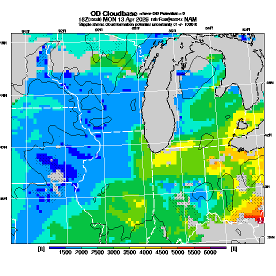 OvercastDevelopment Cloudbase Cloudbase contours are plotted only where that cloudbase is theoretically expected.  See "OvercastDevelopment Potential" and "OvercastDevelopment Cloudbase" parameter descriptions below for more information.  This composite is useful only for locations where the actual potential threshold for OD cloud production agrees with the theoretically-predicted value of zero.