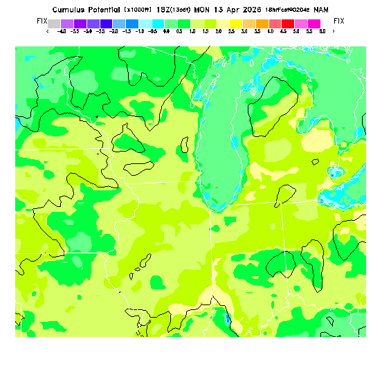 This evaluates the potential for small, non-extensive "puffy cloud" formation in the BL, being the height difference between the surface-based LCL (see below) and the BL top.  Small cumulus clouds are (simply) predicted when the parameter positive, but it is quite possible that the threshold value is actually greater than zero for your location so empirical evaluation is advised.  I would be interested in receiving end-of-season reports on what threshold value worked for your site.  Clouds can also occur with negative values if the air is lifted up the indicated vertical distance by flow up a small-scale ridge not resolved by the model's smoothed topography.  [This parameter is truncated at -10,000 for plotting.]   MoreInfo