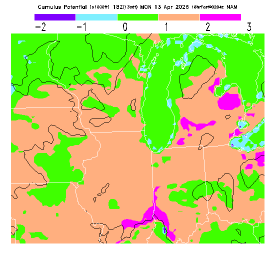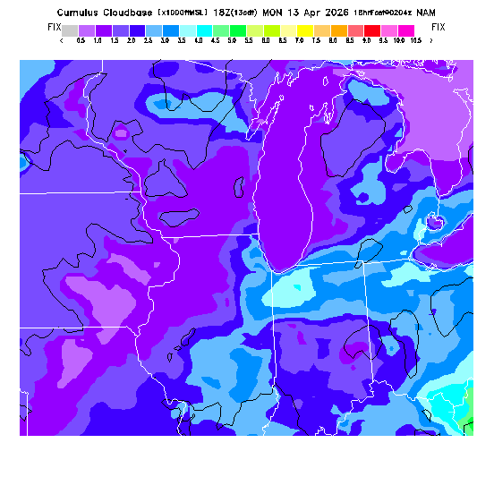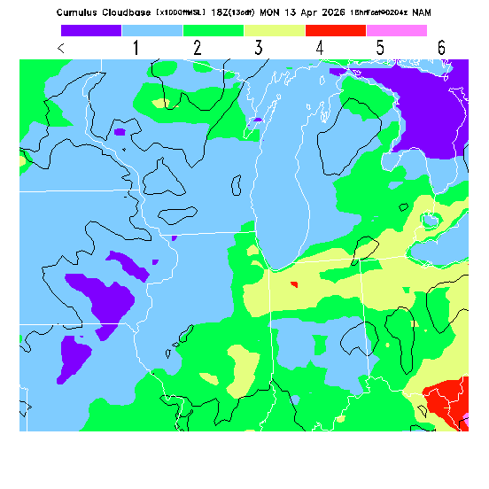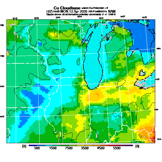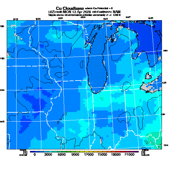Cu Cloudbase Cloudbase contours are plotted only where that cloudbase is theoretically expected.  See "Cumulus Potential" and "Cumulus Cloudbase" parameter descriptions below for more information.  This composite is useful only for locations where the actual potential threshold for cumulus cloud production agrees with the theoretically-predicted value of zero.