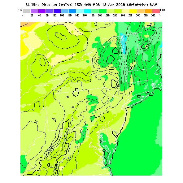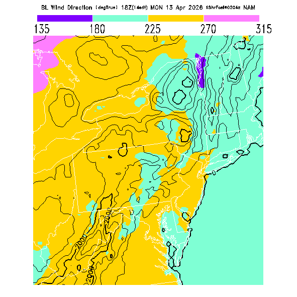 The direction of the vector-averaged wind in the BL.  This prediction can be misleading if there is a large change in wind direction through the BL (for a complex wind profile, any single number is not an adequate descriptor!).  Note that there will be a abrupt artificial gradient at the "cross-over" between 0 and 360 degrees.  MoreInfo