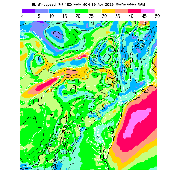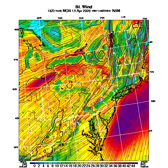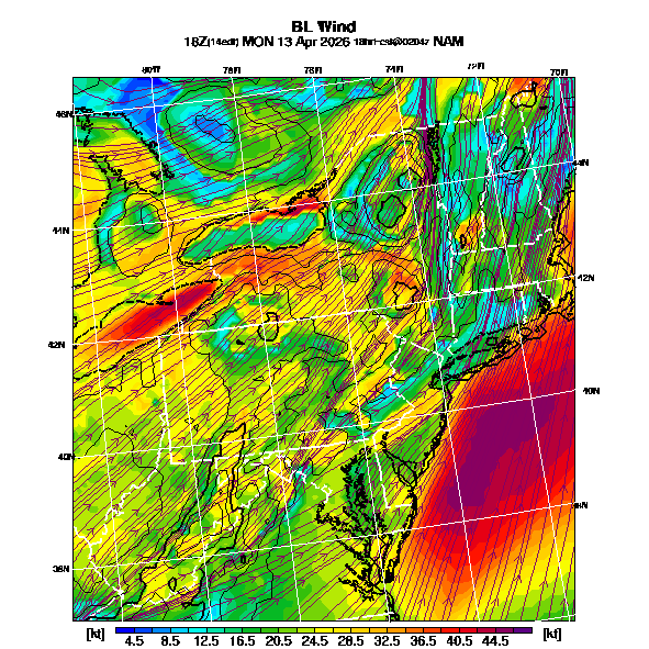 BL Wind Direction streamlines overlay BL Wind Speed contours,  See "Wind Speed in the Boundary Layer" and "Wind Direction in the Boundary Layer" parameter descriptions below for more information.