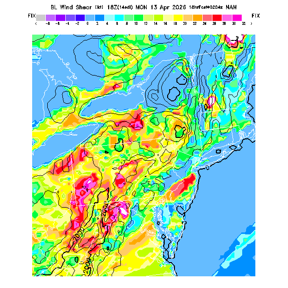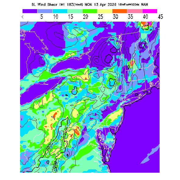 The magnitude of the vector wind difference between the top and bottom of the BL.  Note that this represents vertical wind shear and does not indicate "shear lines" (which are horizontal changes of wind speed/direction).  MoreInfo