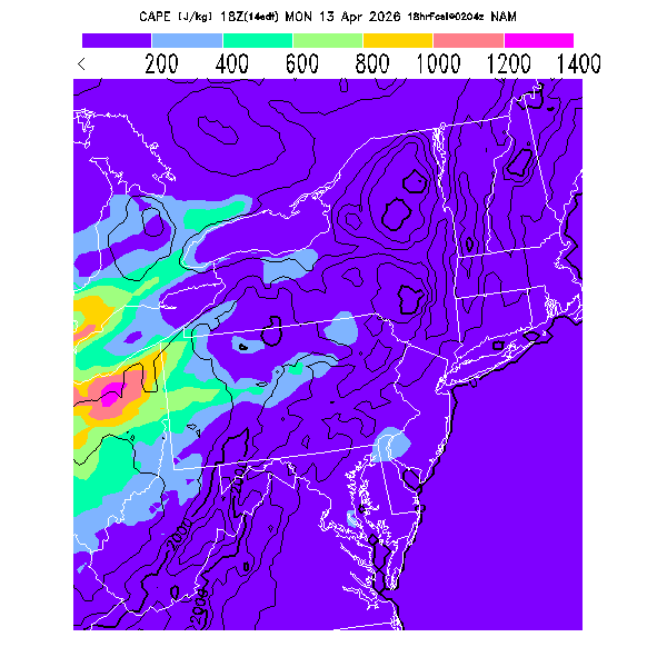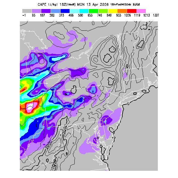 Convective Available Potential Energy indicates the atmospheric stability affecting deep convective cloud formation above the BL.  A higher value indicates greater potential instability, larger updraft velocities within deep convective clouds, and greater potential for thunderstorm development (since a trigger is needed to release that potential).  Note that thunderstorms may develop in regions of high CAPE and then get transported downwind to regions of lower CAPE.  Also, locations where both convergence and CAPE values are high can be subject to explosive thunderstorm development.   MoreInfo