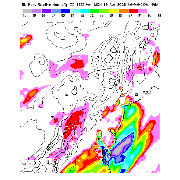 The parameters are averages over 12 km grid squares as forecast by the NOAA's National Centers for Environmental Prediction (NCEP) NAM model. Other NAM forecasts are also available from various sources, including Unisys NAM forecast maps, NAM forecast soundings, and NAM forecast meteograms.  NAM BLIPMAPs are updated as new NAM forecasts become available, normally at 6 hr intervals.