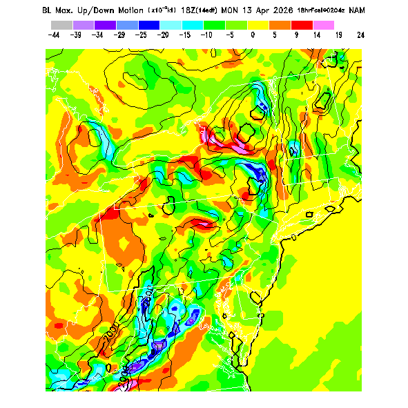 Maximum grid-area-averaged extensive upward or downward motion within the BL as created by horizontal wind convergence.  Positive convergence is associated with local small-scale convergence lines (often called "shear lines" by pilots, meaning horizontal changes of wind speed/direction) - however, the actual size of such features is much smaller than can be resolved by the model so only stronger ones will be forecast and their predictions are subject to much error.  If CAPE is also large, thunderstorms can be triggered.  Negative convergence (divergence) produces subsiding vertical motion, creating low-level inversions which limit thermalling heights.  This parameter can be noisy, so users should be wary.  MoreInfo