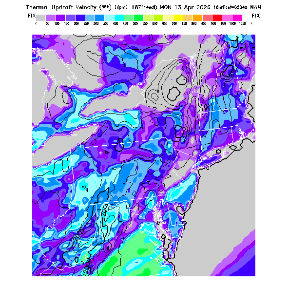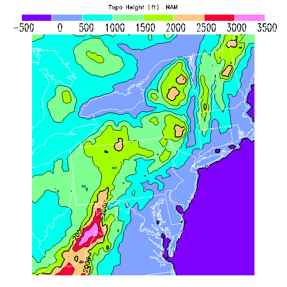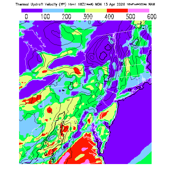 State outlines are depicted on each BLIPMAP in white.  The NAM topography is plotted as black contours, at 500 ft intervals with thicker lines at 2000 ft intervals, to assist in location identification but also to emphasize the smoothed nature of the model topography.  The BLIPMAP does not predict thermal lift created by small-scale terrain features which are not resolved by the model topography, which often give localized updrafts significantly stronger than those over the surrounding smoother terrain.