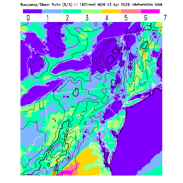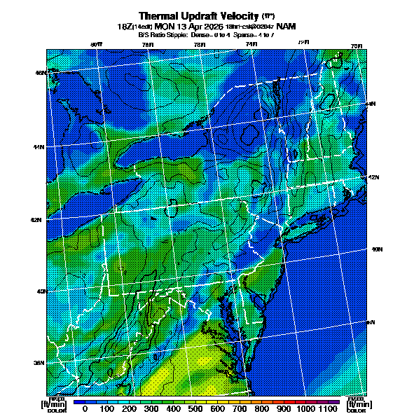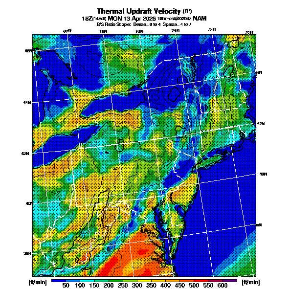B/S Ratio stippling (dense=0-4 sparse=4-7) overlays Thermal Updraft Velocity contours to indicate where strong thermals can be broken by vertical wind shear.  See "Thermal Updraft Velocity" and "Buoyancy/Shear Ratio" parameter descriptions below for more information.