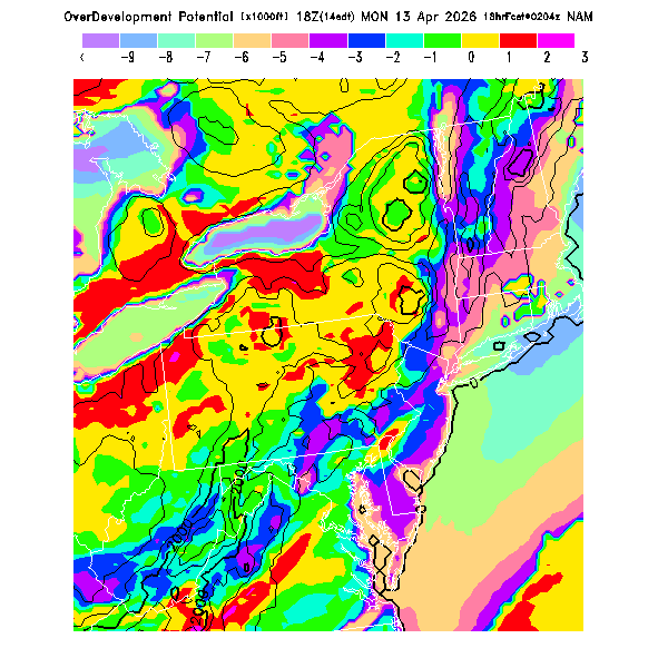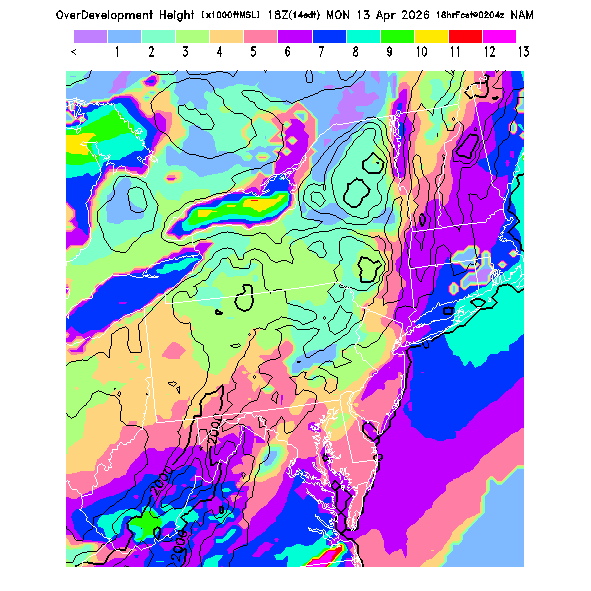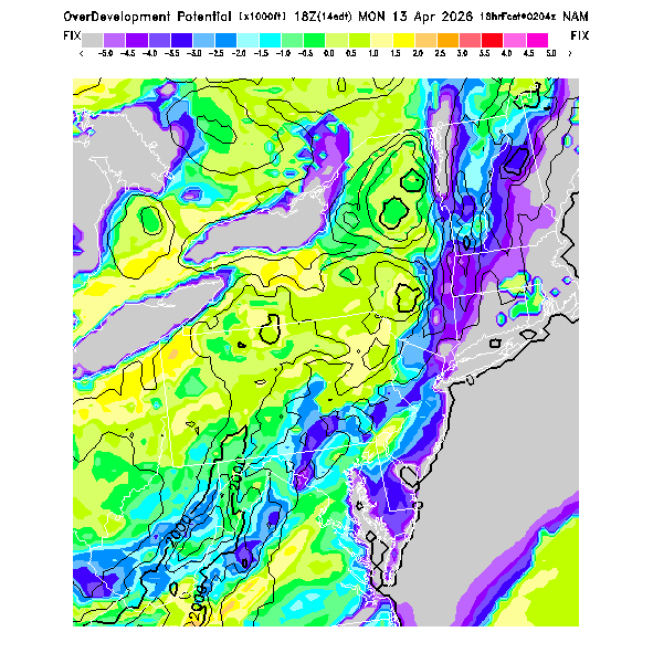 This evaluates the potential for extensive cloud formation (OvercastDevelopment) at the BL top, being the height difference between the BL CL (see below) and the BL top.  Extensive clouds and likely overcast development are predicted when the parameter is positive, with overcast development being increasingly more likely with higher positive values.  OvercastDevelopment can also occur with negative values if the air is lifted up the indicated vertical distance by flow up a small-scale ridge not resolved by the model's smoothed topography.  [This parameter is truncated at -10,000 for plotting.]   MoreInfo
