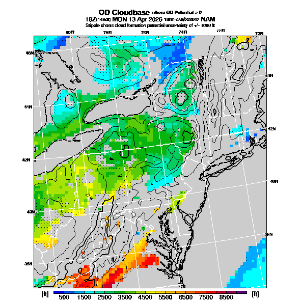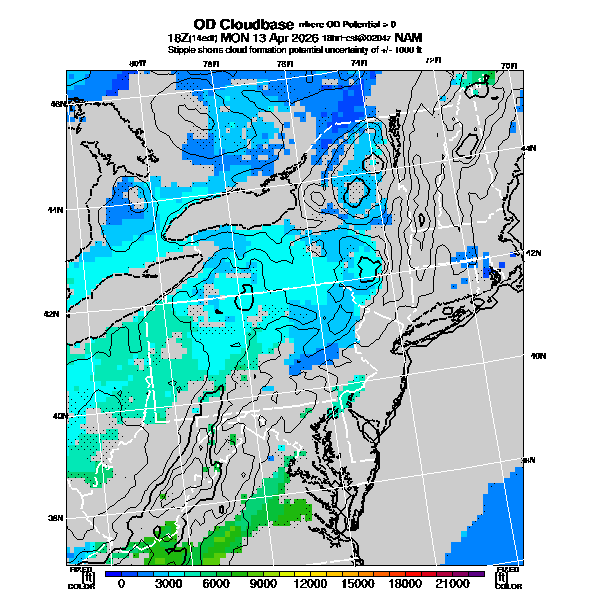 OvercastDevelopment Cloudbase Cloudbase contours are plotted only where that cloudbase is theoretically expected.  See "OvercastDevelopment Potential" and "OvercastDevelopment Cloudbase" parameter descriptions below for more information.  This composite is useful only for locations where the actual potential threshold for OD cloud production agrees with the theoretically-predicted value of zero.