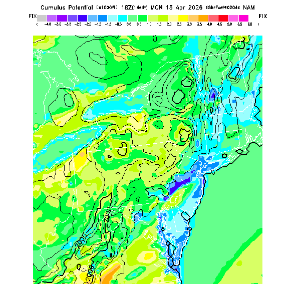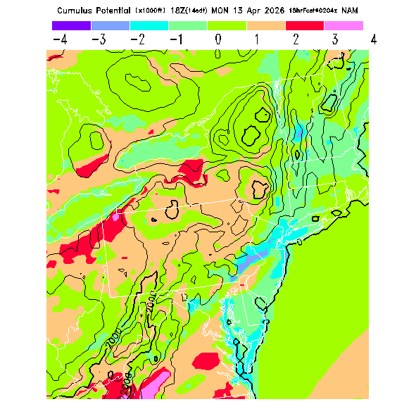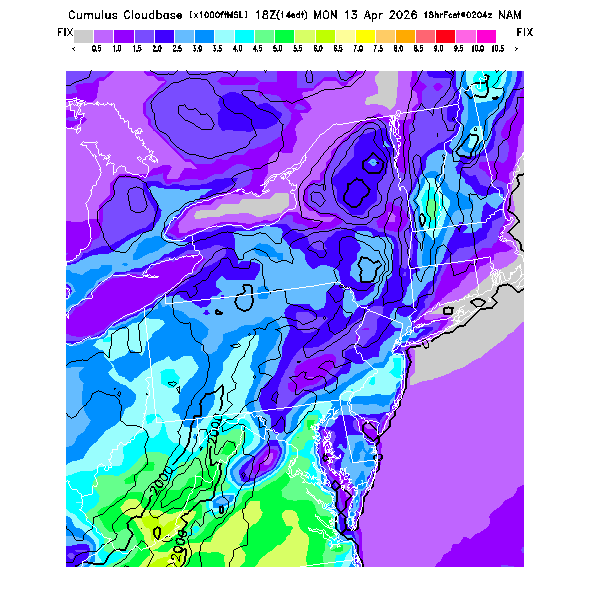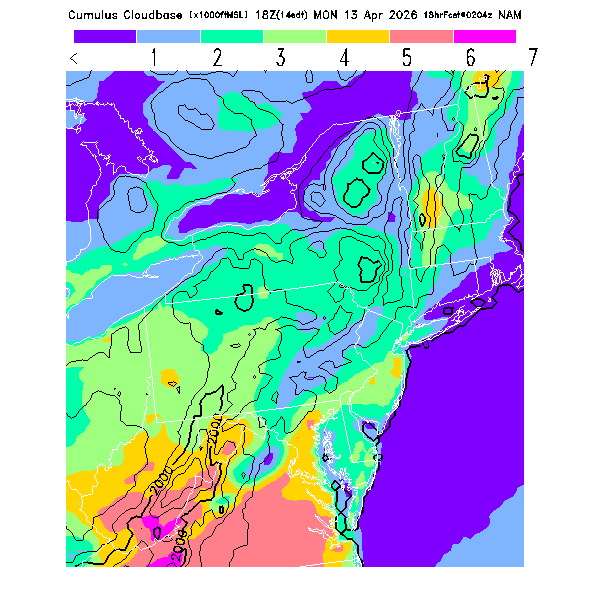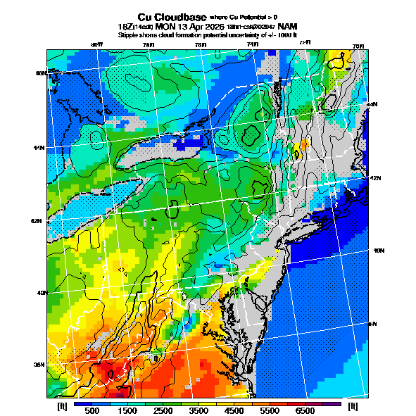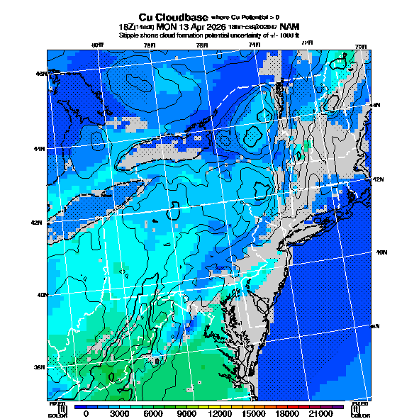 Cu Cloudbase Cloudbase contours are plotted only where that cloudbase is theoretically expected.  See "Cumulus Potential" and "Cumulus Cloudbase" parameter descriptions below for more information.  This composite is useful only for locations where the actual potential threshold for cumulus cloud production agrees with the theoretically-predicted value of zero.