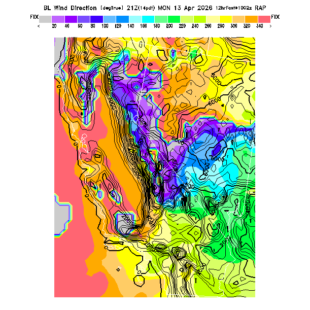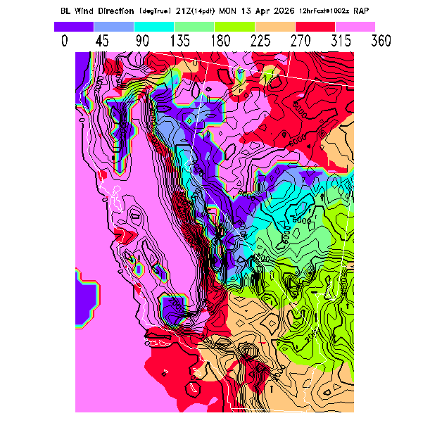 The direction of the vector-averaged wind in the BL.  This prediction can be misleading if there is a large change in wind direction through the BL (for a complex wind profile, any single number is not an adequate descriptor!).  Note that there will be a abrupt artificial gradient at the "cross-over" between 0 and 360 degrees.  MoreInfo