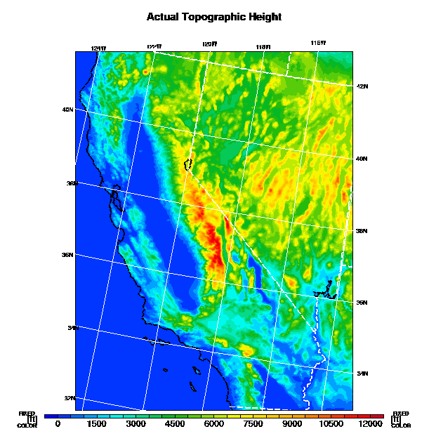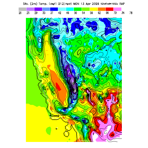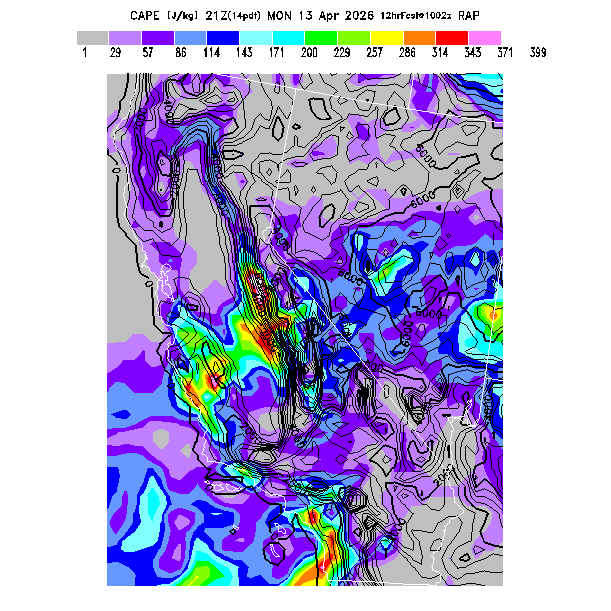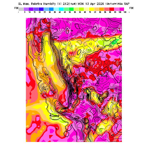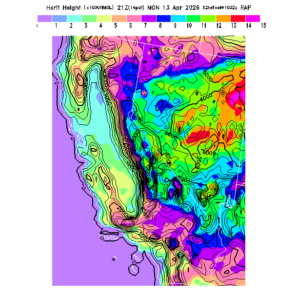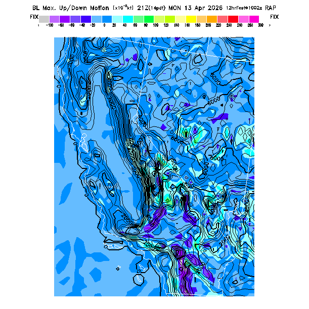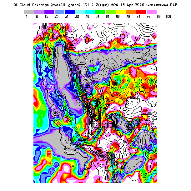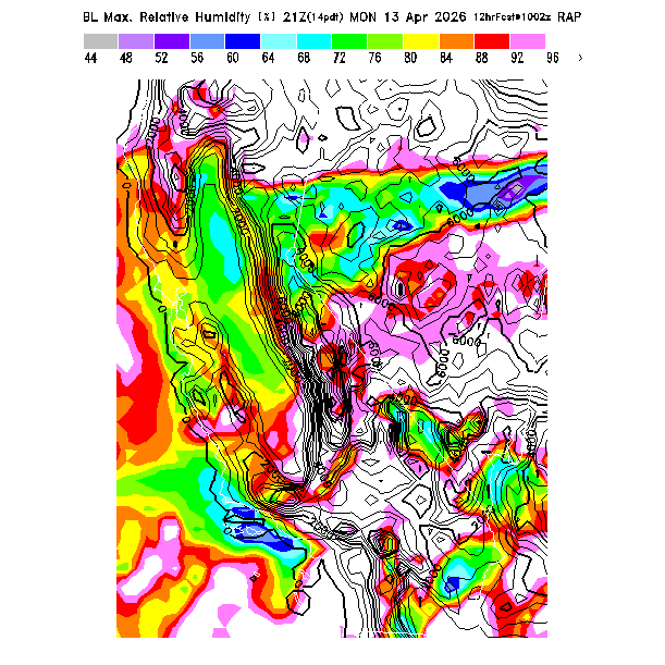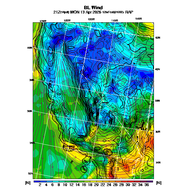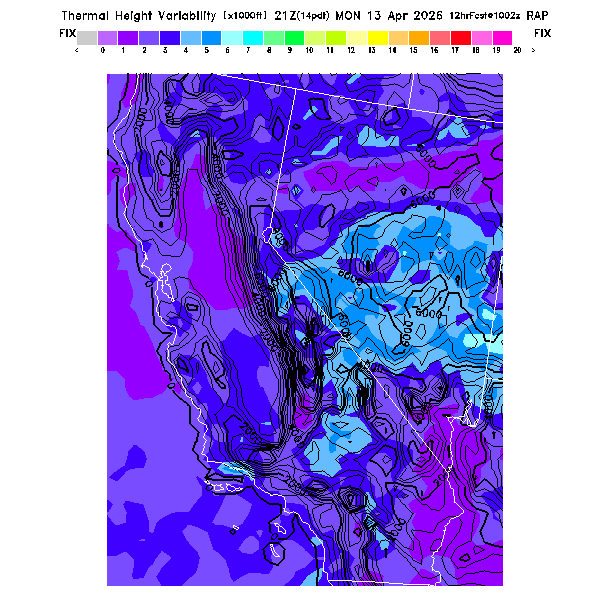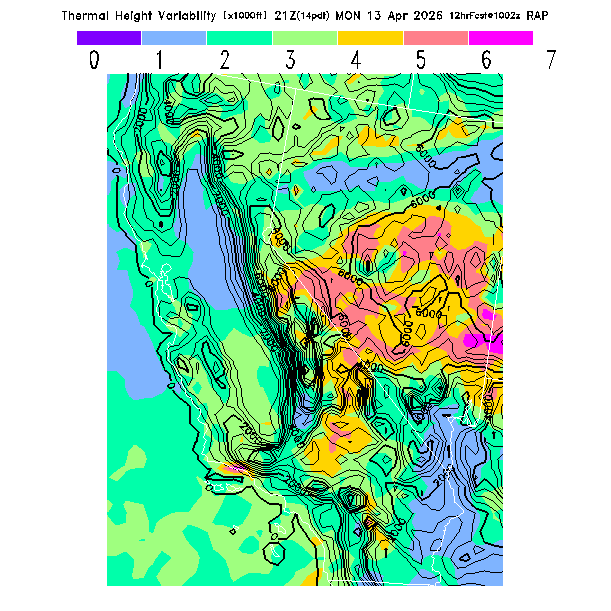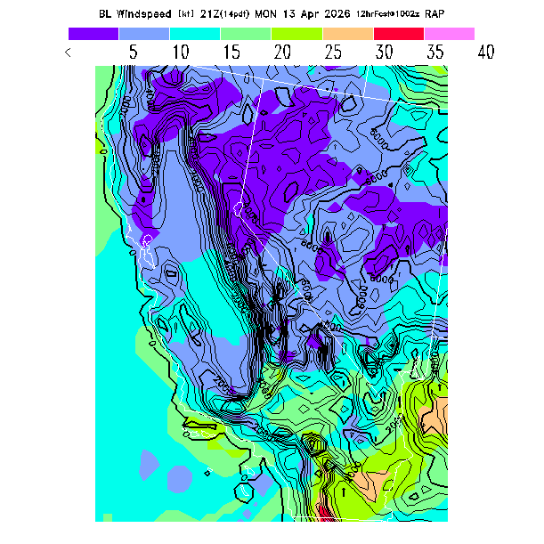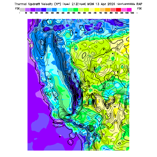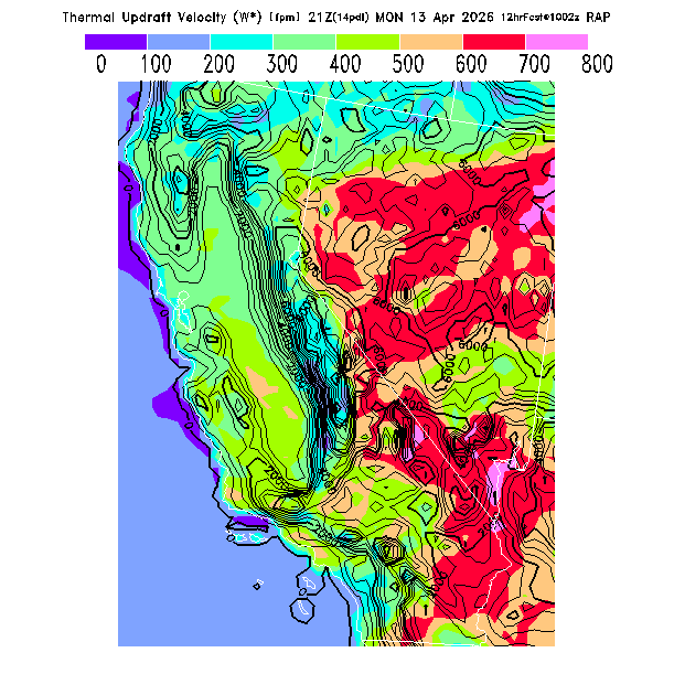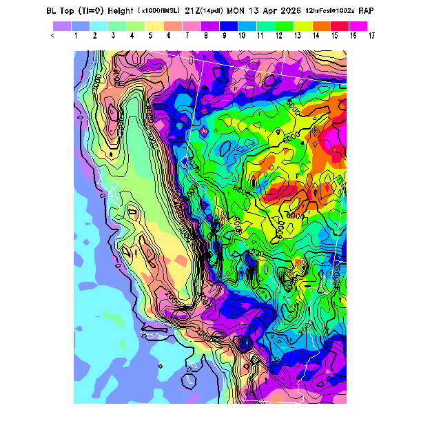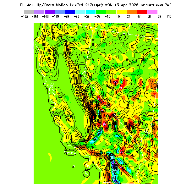 State outlines are depicted on each BLIPMAP in white.  The RAP topography is plotted as black contours, at 500 ft intervals with thicker lines at 2000 ft intervals, to assist in location identification but also to emphasize the smoothed nature of the model topography.  The BLIPMAP does not predict thermal lift created by small-scale terrain features which are not resolved by the model topography, which often give localized updrafts significantly stronger than those over the surrounding smoother terrain.  Maps of location identifiers and additional topography information for this region are available at the CANV Grid Orientation webpage.