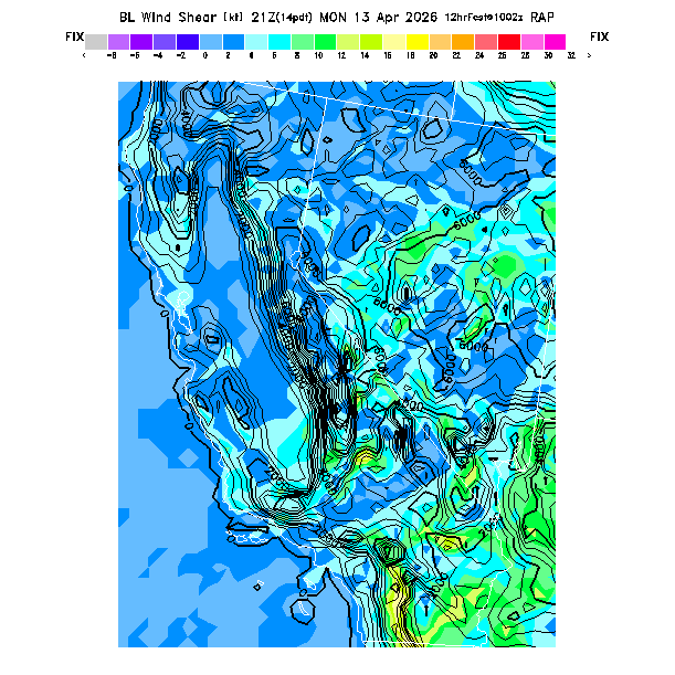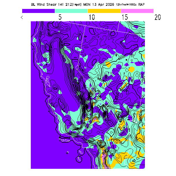 The magnitude of the vector wind difference between the top and bottom of the BL.  Note that this represents vertical wind shear and does not indicate "shear lines" (which are horizontal changes of wind speed/direction).  MoreInfo