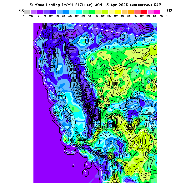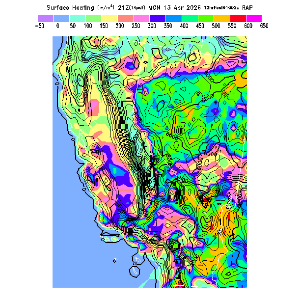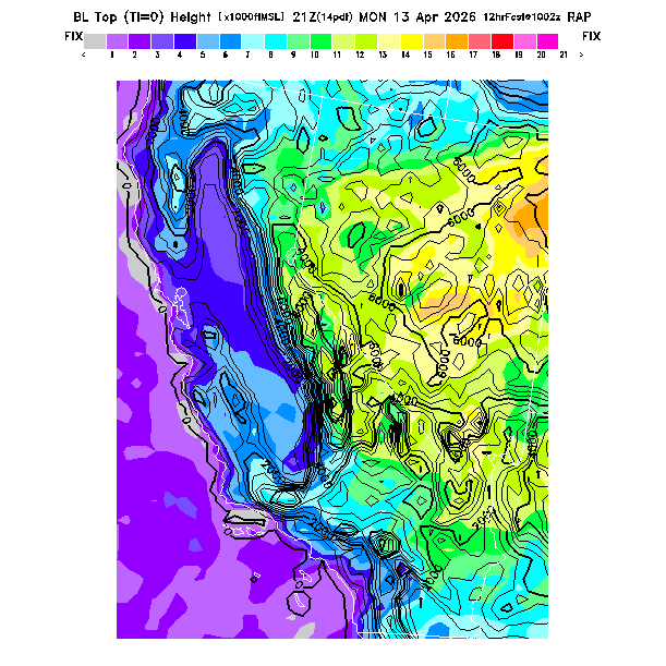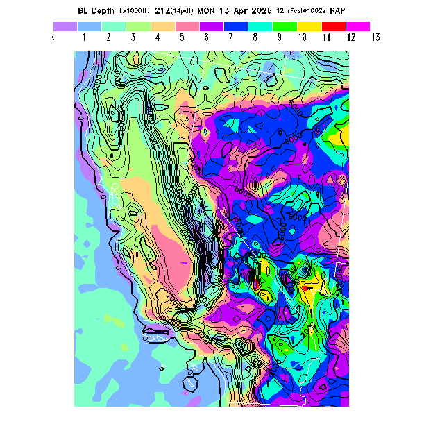 BLIPMAPs predict thermal soaring conditions resulting from surface heating of the Boundary Layer (BL), the scientific term for the turbulent atmospheric region mixed by surface-based thermals (so thermal tops occur at the top of the BL).  The BLIPMAP program post-processes numerical weather model predictions to provide parameters suited to the needs of soaring pilots and presents them in graphical format, as in this sample BLIPMAP.  Relative differences, both in location and in time, are expected to be more reliable indicators of soaring differences than are the precise numerical values.  BASIC thermal forecast parameters gives a short list of the parameters most important for thermal soaring.
