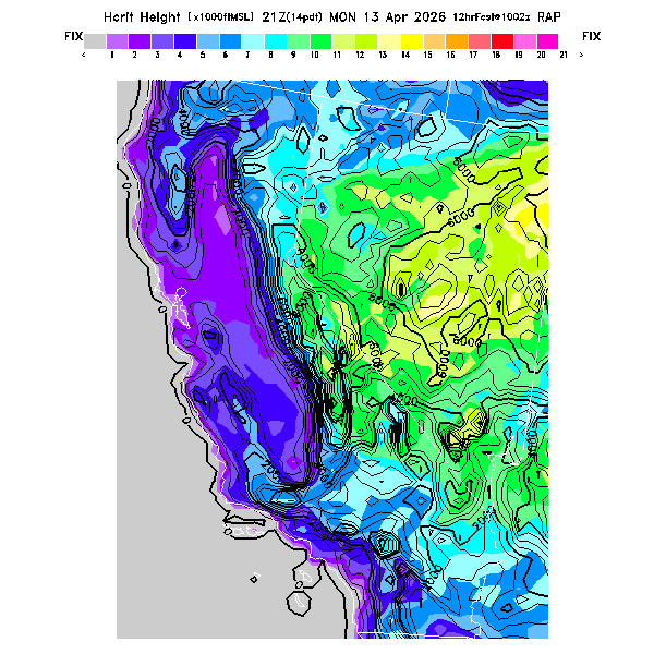 A sequence of forecasts, all for the same validation time of 21Z, is produced during the day as new observational data becomes available, each updated forecast having a shorter forecast period between the latest observation and validation times.  [Model initialization (observation analysis) time + Forecast Period = Validation (forecast) time]  The most important link is the first link on each line, "Latest", which gives the most recent (shortest period) forecast. The following "FirstToday" link gives the first forecast from the current day, which can be used to determine whether the model is significantly altering its predictions during the updating.  The last link, "PreviousDay", gives the last forecast from the previous day's prediction sequence, useful for those who want to compare their experiences from yesterday's flight to the RAP BLIPMAP predictions.  At the top of each forecast plot is the name of the parameter, the validation date and time, the forecast period, and the data source.