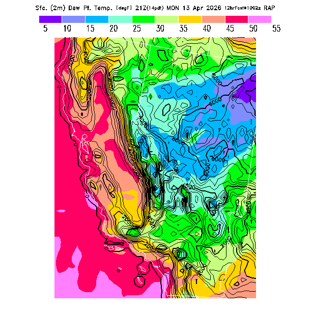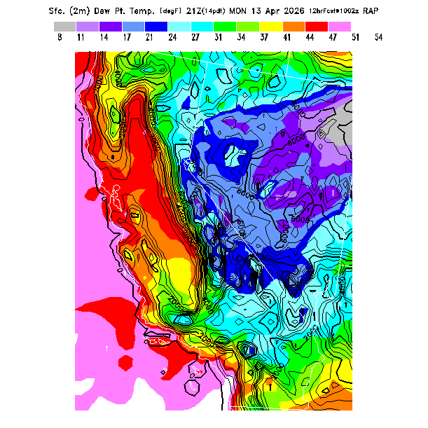 This model-predicted surface dew point temperature can be compared to the actual dew point temperature at 2m during the day to evaluate the accuracy of model moisture predictions.  MoreInfo
