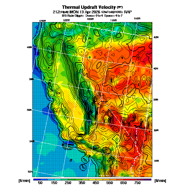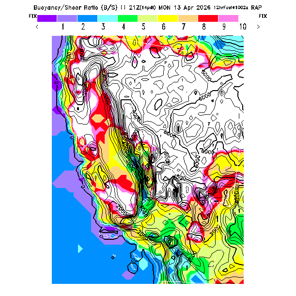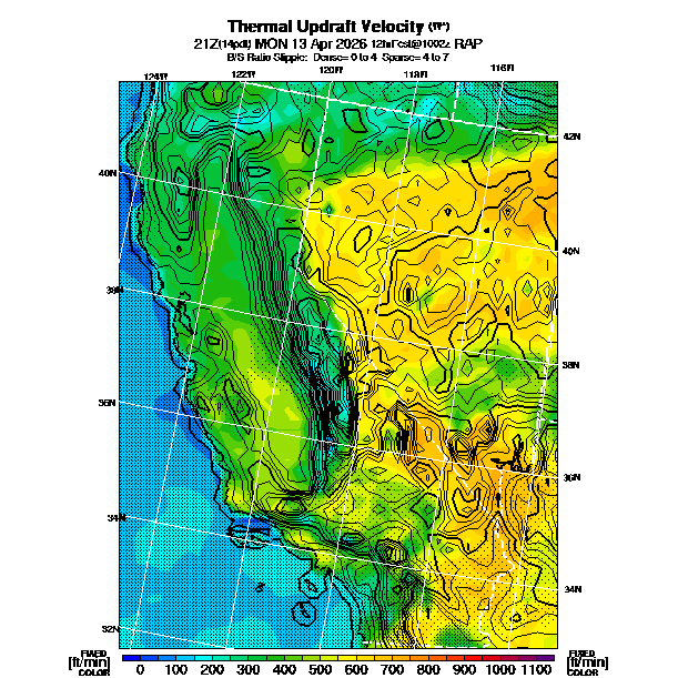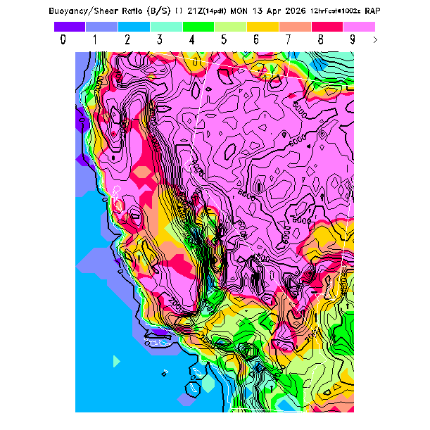B/S Ratio stippling (dense=0-4 sparse=4-7) overlays Thermal Updraft Velocity contours to indicate where strong thermals can be broken by vertical wind shear.  See "Thermal Updraft Velocity" and "Buoyancy/Shear Ratio" parameter descriptions below for more information.