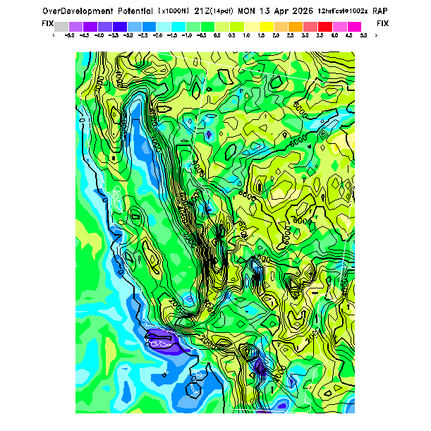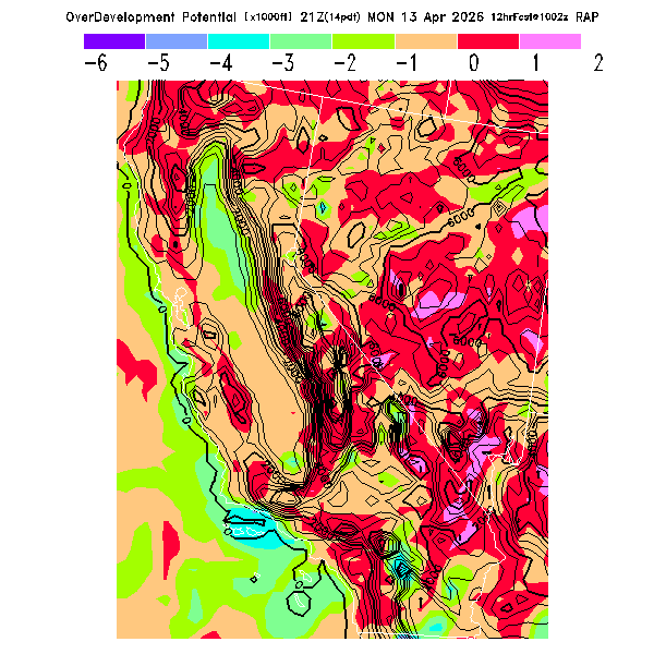 This evaluates the potential for extensive cloud formation (OvercastDevelopment) at the BL top, being the height difference between the BL CL (see below) and the BL top.  Extensive clouds and likely OvercastDevelopment are predicted when the parameter is positive, with OvercastDevelopment being increasingly more likely with higher positive values.  OvercastDevelopment can also occur with negative values if the air is lifted up the indicated vertical distance by flow up a small-scale ridge not resolved by the model's smoothed topography.  [This parameter is truncated at -10,000 for plotting.]   MoreInfo