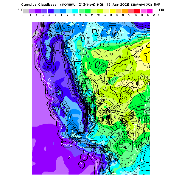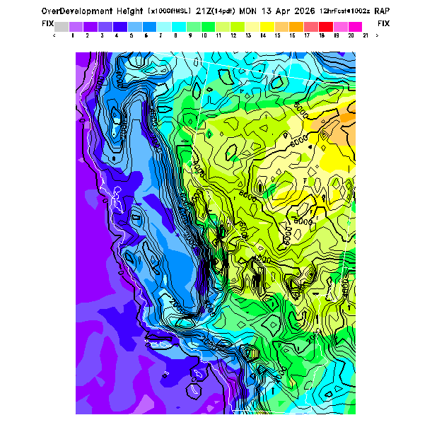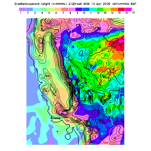 Height of the average dry thermal tops, or Thermal Index TI=0 height.  Over flat terrain maximum thermalling heights will be lower due to the glider descent rate and other factors.  However, thermal tops will be higher over small-scale topography not resolved by the model and some pilots have reported that in elevated terrain the heights they can reach over local terrain features correspond better with the TI=0 height than with Hcrit.  In the presence of clouds the thermal top will increase, but the maximum thermalling height will then be limited by the cloud base (see the "Cloud prediction parameters" section below).  [This parameter is truncated at 22,000 for plotting.]   MoreInfo